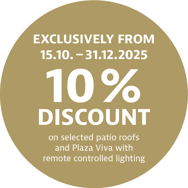 - 10% discount on your glass patio roof Terrazza Pure, Terrazza Sempra or Terrazza Originale or your pergola awning Plaza Viva including light bars, hand transmitter and remote receiver