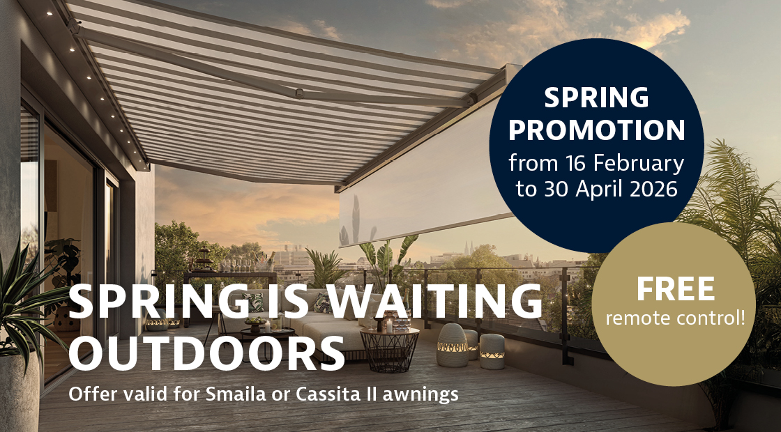 A free remote control when you purchase a high-quality Smaila or Cassita II awning, the handset and receiver are included free of charge. As part of our spring promotion, you can get fabrics from our sustainable modern basic blue® collection at the price of our standard fabrics.